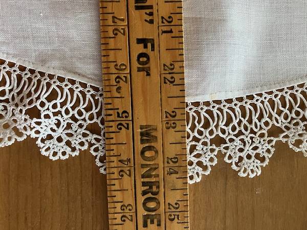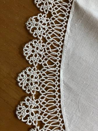 *Handmade lace is a lost art and borders this lovely circular doily. *Overall circumference is 24”; tatting measures 1 7/8” wide. *Linen needs replacement: some staining and small holes.