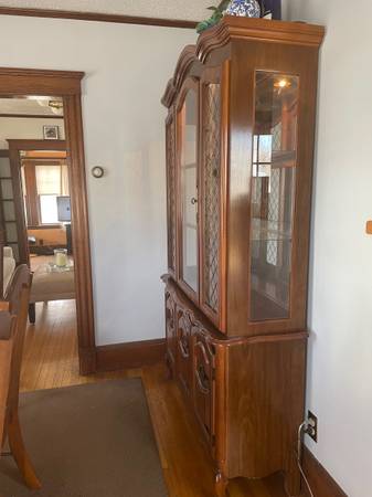 Bassett dining room table with 6 chairs, 2 leaves and hutch all in good condition normal usage seats are upholstered (no pets in home)