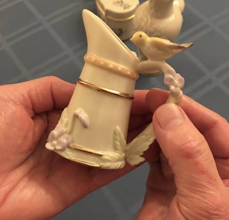 LENOX CHINA TREASURES COLLECTION BIRD ON WATERING CAN MINIATURE PITCHER VASE WITH VIOLETS. HAND CRAFTED IN THAILAND. BEAUTIFUL VASE WITH OR WITHOUT FLOWERS.