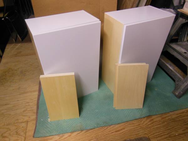 Available are 2 white upper cabinets like new. They were prepped for install but not installed. Size 12" deep + 1" for door, 21" wide, 33" high.