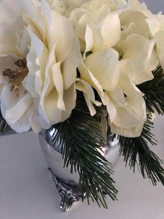 Silver Plated handled Pitcher - ornate four footed base and handle. Currently with White silk flowers and silk pine but can be easily changed to any decor. Measures approximately 7 1/2" Tall X 7"...