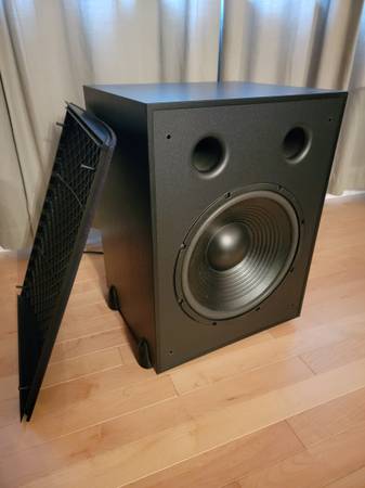 PSB Image Series Subsonic 6 Subwoofer for your Home Entertainment system. GREAT new condition, sounds AMAZING!!. Its “vented port” cabinet has a 12 inch driver, a 120 watts continuous and 440 watts peak amplifier and a frequency response that goes down to 25 Hz. Includes Monster cable shown in photo!!