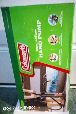 Coleman (The Outdoor Company), DUAL ACTION HAND PUMP/ DUAL ACTION QUICKPUMP. UNIVERSAL FAST INFLATION AND DEFLATION OF VIRTUALLY ALL PRODUCTS: USE WITH COLEMAN DOUBLE LOCK VALVE; USE WITH PINCH VALVES; USE WITH BOSTON VALVES. (NOTE: Pump will not work with stem valves or needle valves commonly used on bike tires, basketballs, etc.). Inflates virtually any brand of airbed inflatable mattress. Great for camping or RV's. Model# 2000001074. UPC# 0 76501 59875 9. Comes with original box and paperwork. $15.00