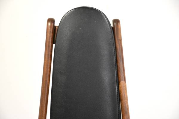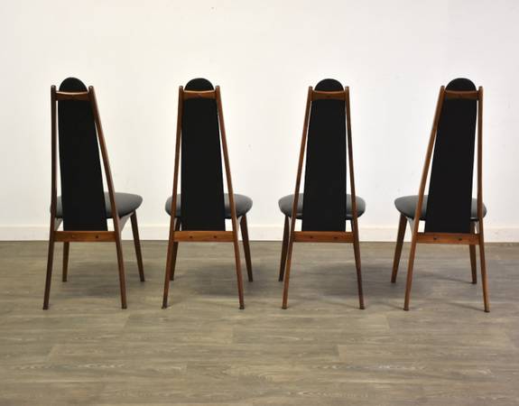 A set of four mid century modern walnut dining chairs made in the style of Adrian Pearsall. minor slits in seats. Seat height is 18.5”. 18” wide. 25” deep. 43.75” tall. Delivery for hire....