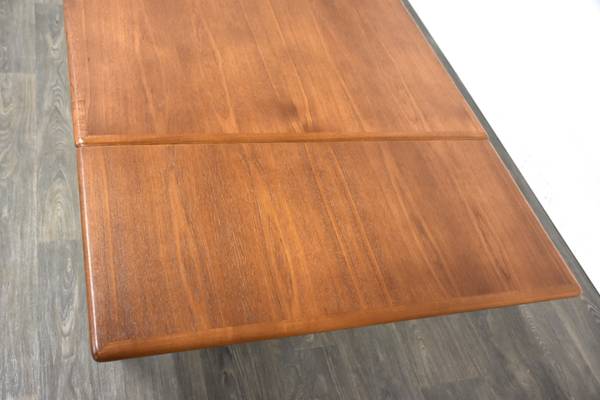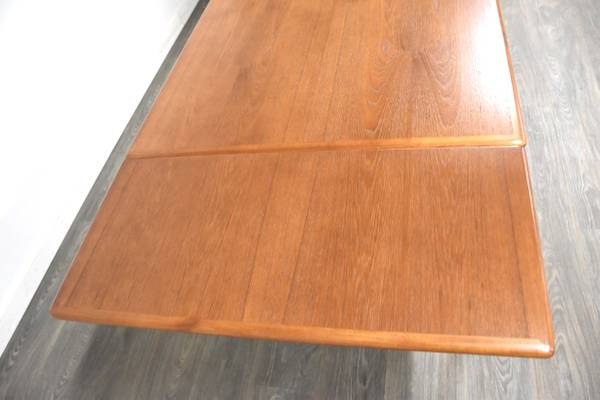 A mid century modern teak draw leaf dining table with two self storing leaves. Made in Denmark. Professionally refinished. Fully expands to 64”. 33.5” wide. 33.5” deep. 29” tall. Delivery available 😃