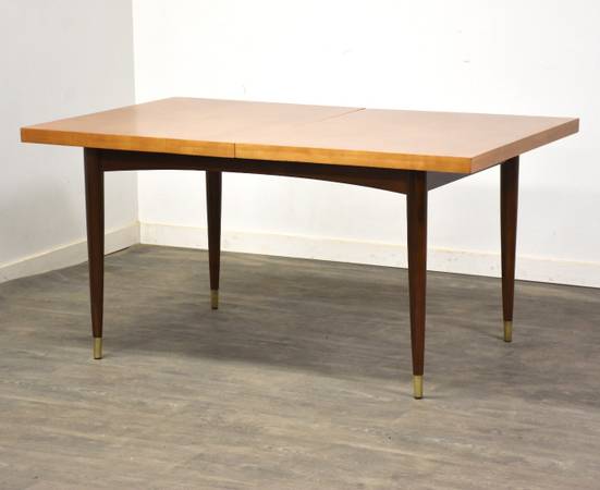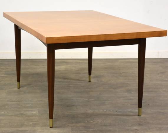 A mid century modern maple top dining table with walnut legs made American of Martinsville. Professionally refinished. 60” wide. 38.25” deep. 30” tall. Delivery for hire.