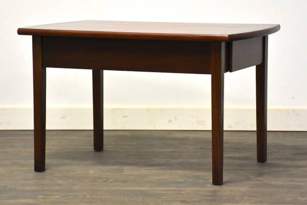 A mid century modern walnut end or side table with a single drawer. Professionally refinished. 20” wide. 30” deep. 18” tall. Appointment only.