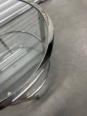 Beautiful glass and chrome end table. Dimensions: 24" round x 24" height.