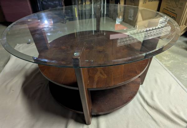 $100 Coffee & 2 End Tables - 2 Tiered Round Glass & Wood 1 Coffee Table 2 End Tables (1 pictured) Dimensions Coffee: 37" W x 17" H Dimensions End Tables: 25" W x 26" H See Pictures for...