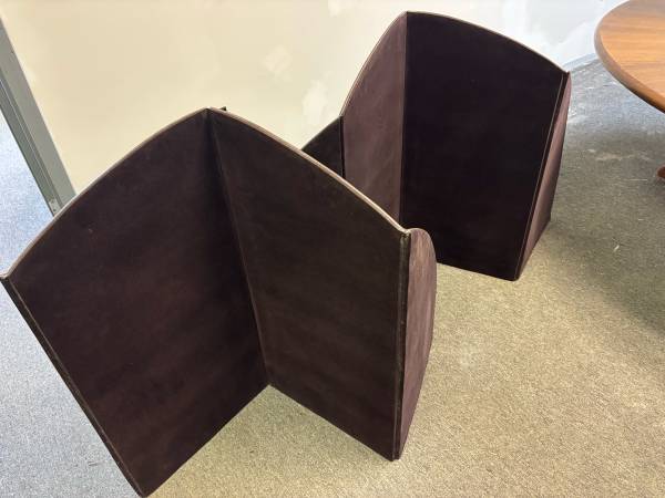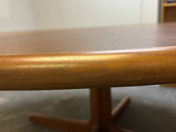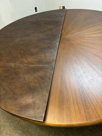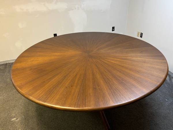72” round solid walnut table. 4 leg pedestal base. 1”thick table top. Seats 8-10. Comes with 2 folding protective pads; part of pad does not completely lay flat. Beautiful wood grain. Very faint...