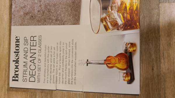 Never opened or used Brookstone decanter with set of two glasses included. Shaped like a classical guitar. Originally $60. Will sell to best offer. Tags - liquor alcohol container bottle glass...