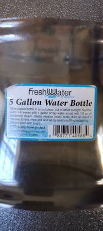 Very clean used 5 gallon heavy plastic water bottle with snap on cap and built in handle. (Does not contain water) Approximately 19" high.