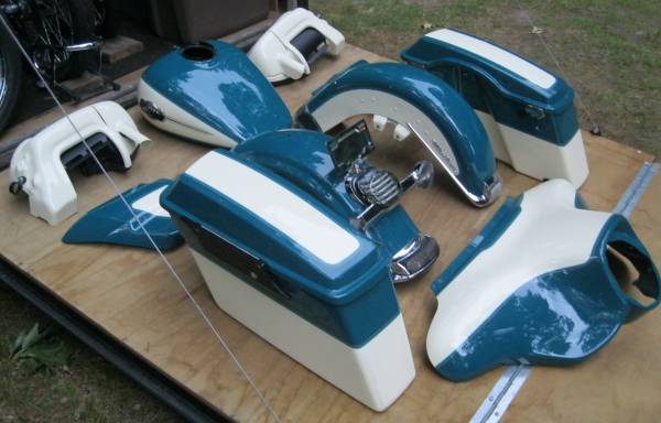 Harley Davidson factory painted set. Deep turquiose and antique white with teal and tan stripes. Fuel injected 6 gallon gas tank with matching front fairing matching front and rear fenders, (LED lighting not included), saddlebags, side covers, and vented lower fairings. This is a steal @ $2,000.00 for all. This sheet metal set will fit 2008 thru 2013 FLH Touring Models. / Please call this Google phone number I use to screen my reply's, (Too many scammers) I'll call you back soon. Please Call 978-294 984eight after 10:00 a.m. I don't text so, Include a phone number with your reply if you want me to reply back to you, Thanks for looking.
