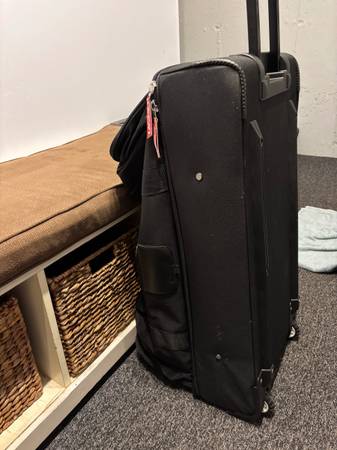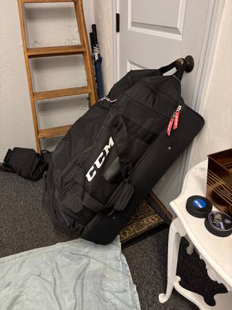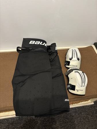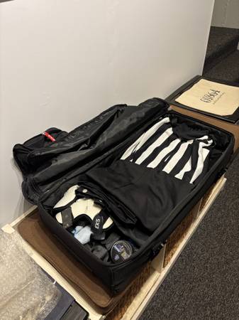 2 gear bags, 1 rolling. Striped shirt, 1 vinyl pants, 1 cloth pants, elbow pads, hip/thigh pads, possibly black helmet w half shield (may sell separately)
