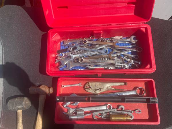 Toolbox filled with tools Mostly all different size wrenches A hammer and a mallet Vise grips etc 15.00 for all including toolbox
