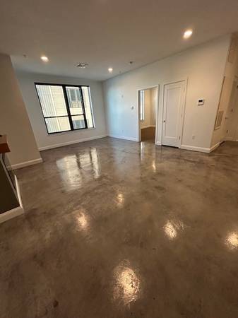 Gleaming concrete flooring & modern kitchen.