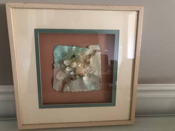 Beautiful decorative frame wall art. Clean and in very good condition. Cash/PayPal/Venmo is accepted. Color: Soft peach, green and off white Frame: Off white wood Frame Size: 17"x 17" x 1 1/4"