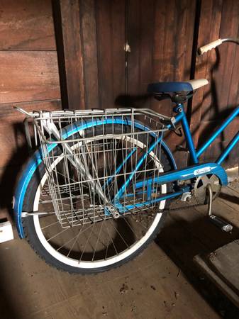 Vintage girls Columbia bicycle with baskets………This bike should clean up very nice………Was riding like new when it was put in a barn many years ago………$60. Cash only.