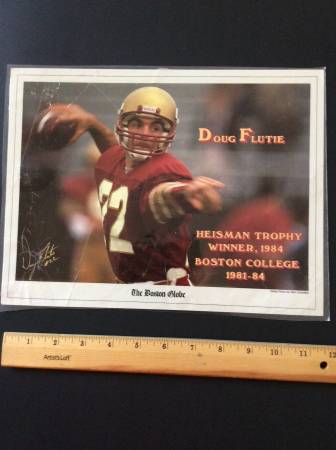 Doug Flutie lot 1)...... 12x9 laminated 1984 Heisman Trophy winner picture. Boston College 2)......The Boston Globe front page of the Miracle pass Flutie to Phelan November 24, 1984 (replica)...