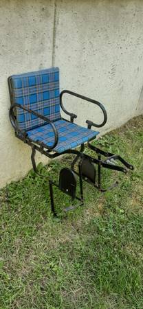 Child seat attachment for bicycle from early 1970s English bicycle. Seat and cushion both in excellent condition. Seat and arms fold down when not being used. Foot pegs and hardware all accounted for. Complete seat and attachment setup. Many do not have cushion and sell for $125 and more. Asking only $55. Call or text five08 80nine 0six59