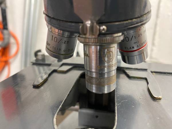 Used AO Spender microscope. Needs to be cleaned up but working condition is excellent. Comes with case Call or text Jim $800.00 or bro Description This microscope is ideal for educational, medical...