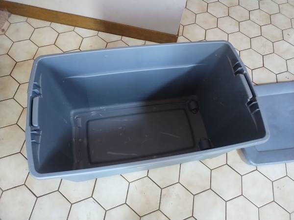 Sterilite 45 gallon storage tote with wheels Came from a working home. Always indoors. This tote has lots of life left in it. Close hasps work. Wheels work.