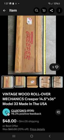 Wood mechanic creeper model 33s. Excellent condition. Rolls nice, pad has no rips, wood has no cracks. Sells on ebay for $85-125 with shipping. Asking only $30. Call or text five08 80nine 0six59